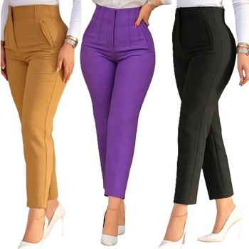 Pantalones de mujer de nueve puntos con cremallera plisada de color sólido delgado para mujer